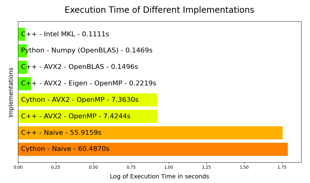 'C++ - AVX2 - Eigen - OpenMP', 'C++ - AVX2 - OpenBLAS', 'Python - Numpy (OpenBLAS)', 'C++ - Intel MKL']